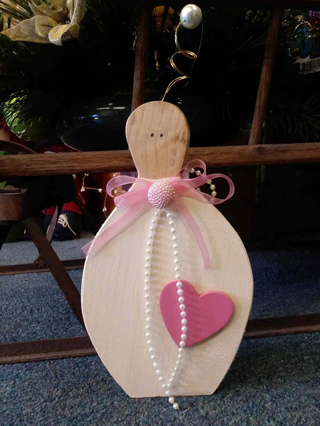 Handcut painted spruce, finished with an antique button and matching ribbon.