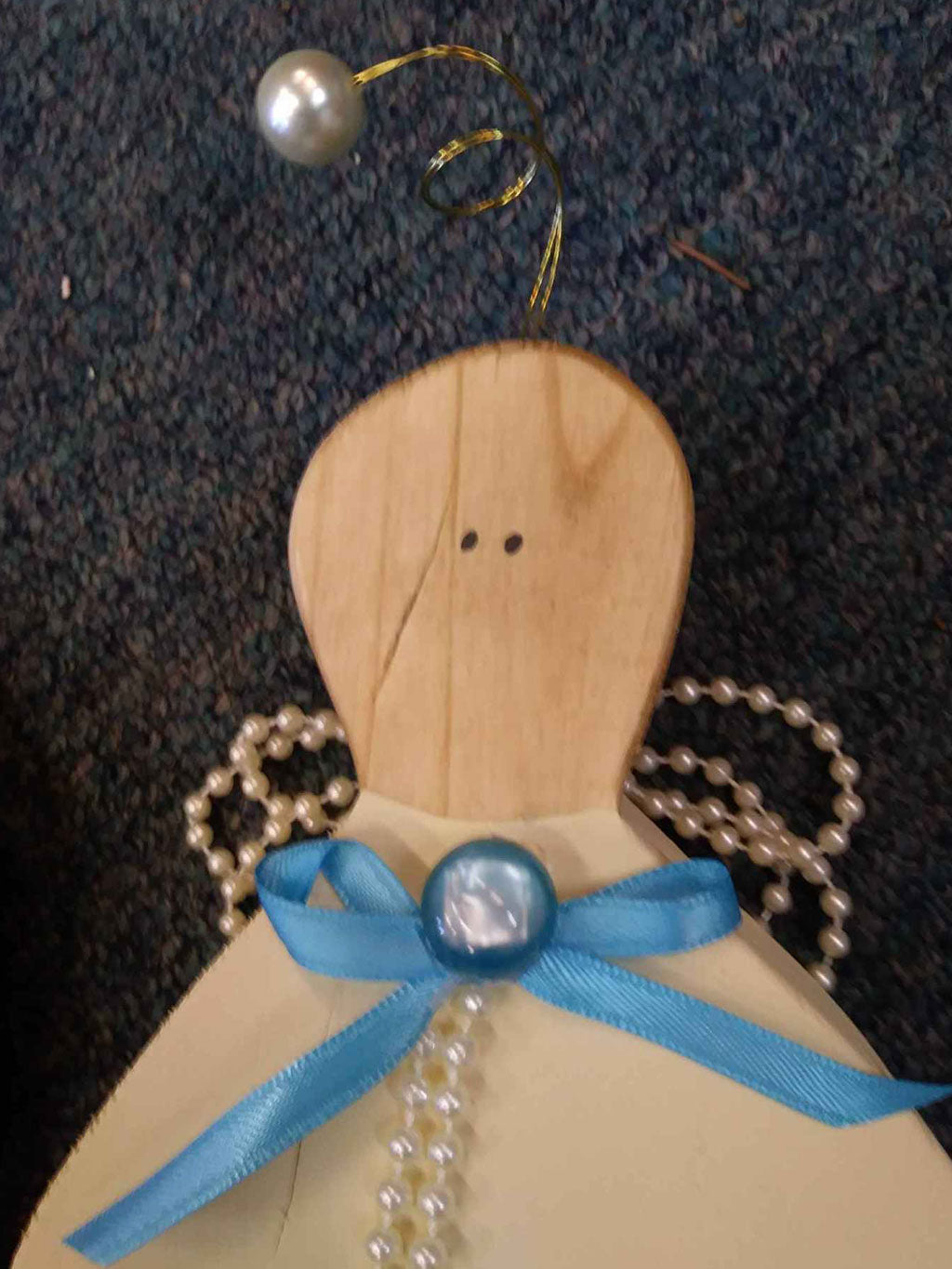 Handcut painted spruce, finished with an antique button and matching ribbon.