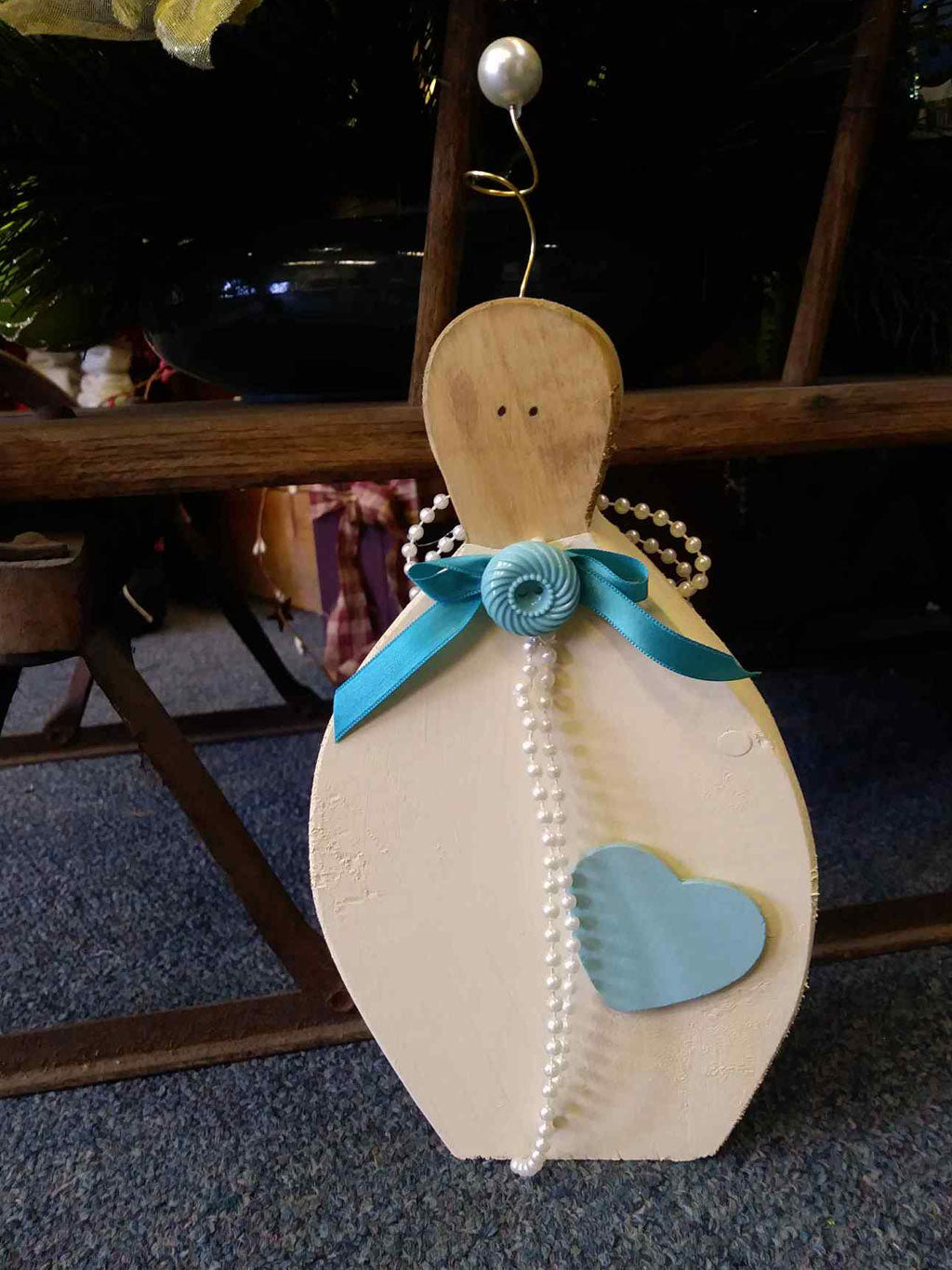 Handcut painted spruce, finished with an antique button and matching ribbon.