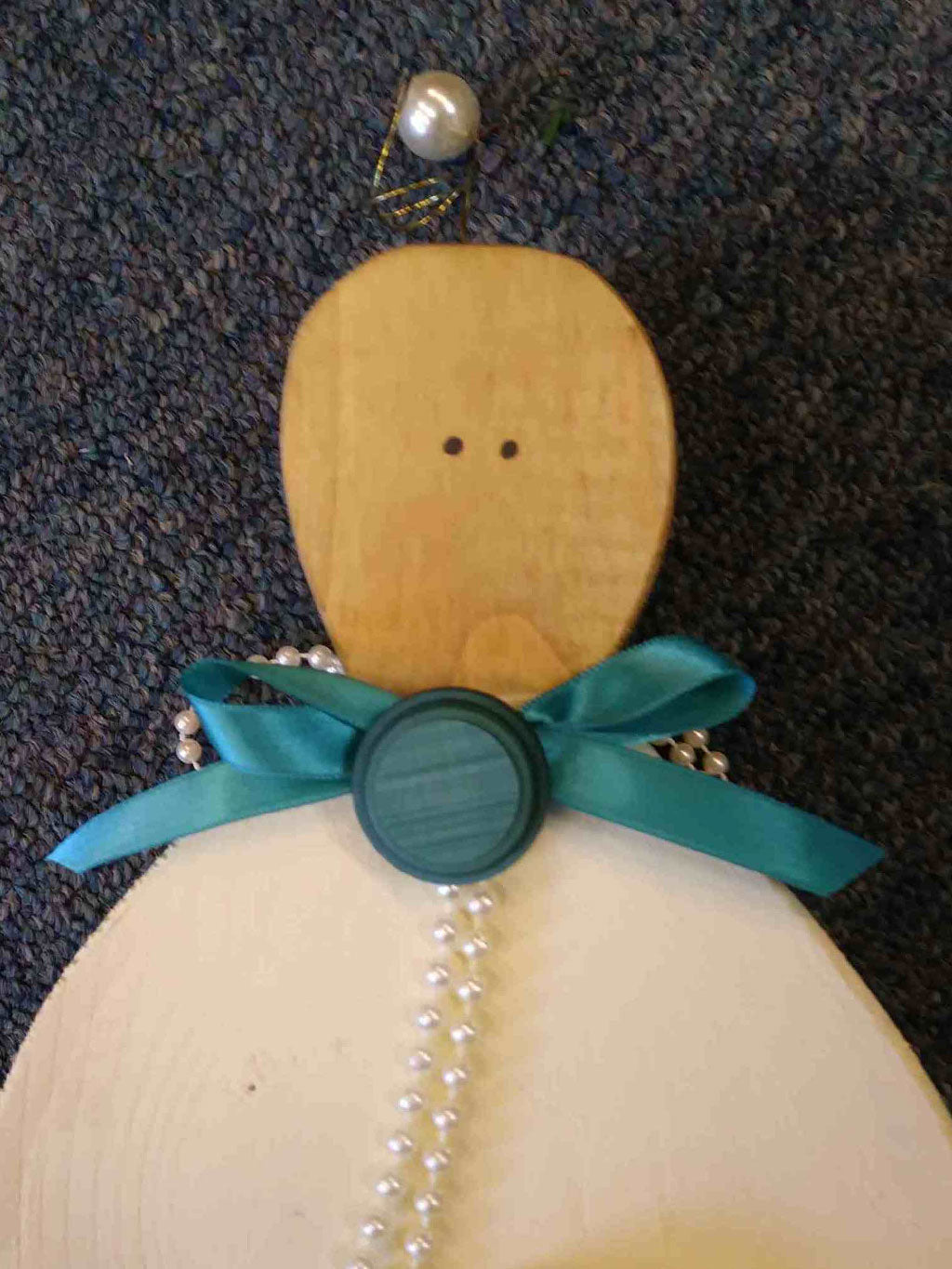 Sea blue ribbon with 1 in. teal button. Pearl String wings.